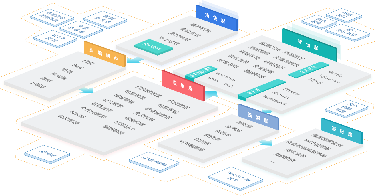 - 元數據管理、多維分類管理、復雜流程審批、網上辦事、場景服務、資源目錄服務、網站SAAS服務