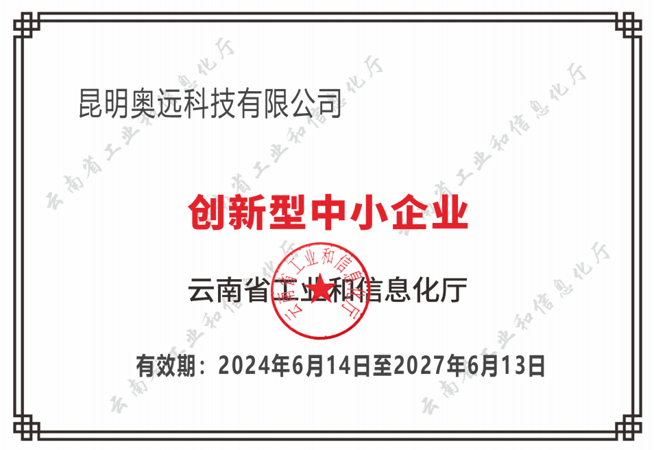 近日,昆明奧遠科技有限公司被云南省工業和信息化廳授予“創新型中小企業”稱號,這一榮譽不僅是對公司在創新領域所取得成績的高度認可,更是對其未來發展的極大鼓勵。